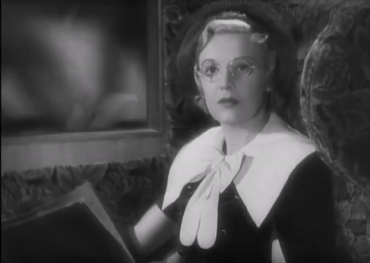 Pamela is first introduced as an independent woman riding in a private train car. She is wearing a simple black dress with a sailor collar and a large bow. The sailor collar and large bow are a visual draw that are associated with male sailors or the classic bowtie. This serves to further emphasize her independence. She also has a large book and is wearing reading glasses, which emphasizes the fact that she is an educated woman.
